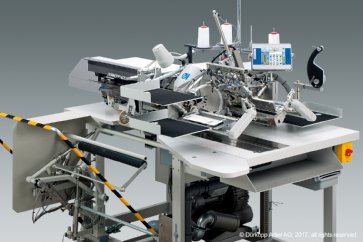 For straight and optionally also for slanted piped pockets, flap pockets and welt pockets with automatic feeding of piping strips. Optionally with fully automatic flap slant recognition. Optionally with automatic feeding of additional parts. Optionally with automatic incision of the piping ends.