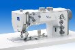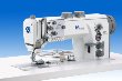 Single needle lockstitch flat bed machine with bottom feed, needle feed and alternating feet, edge trimmer, electromagnetic thread trimmer, add. electropneumatic switchable thread tension, integrated 2. Stitch length, electropneumatic seam backtacking and sewing foot lift, electropneumatic quick stroke adjustment, with XXL-hook, integrated sewing light (LED)