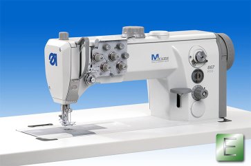 Twin-needle lockstitch flat bed machine with bottom feed, needle feed and alternating feet and a maximum stitch length of 12 mm. The 867-290040 ECO is equipped with oversized XXL vertical hooks. The bobbin thread capacity increased by 70% makes it possible to reduce the number of bobbin changes nearly by half. With the M-TYPE series a vision has become reality - a platform for medium heavy duty machines creating a new dimension of functionality and flexibility for all kinds of medium -weight applications. The lockstitch flat bed machine class 867, the first model of M-TYPE series, will set new standards. Above all, the modern design allows an enlarged clearance under the arm as well as a better view on the sewing area. The highly efficient sewing parameters combined with a great variety of equipment make the 867 an ideal operating means for universal use.
