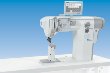 Single needle lockstitch post-bed machine with DA Direct Drive, wheel feed, needle feed and top driven roller, with electromagnetic thread trimmer, auto back-tacking and auto presser-foot lift. Right small post.